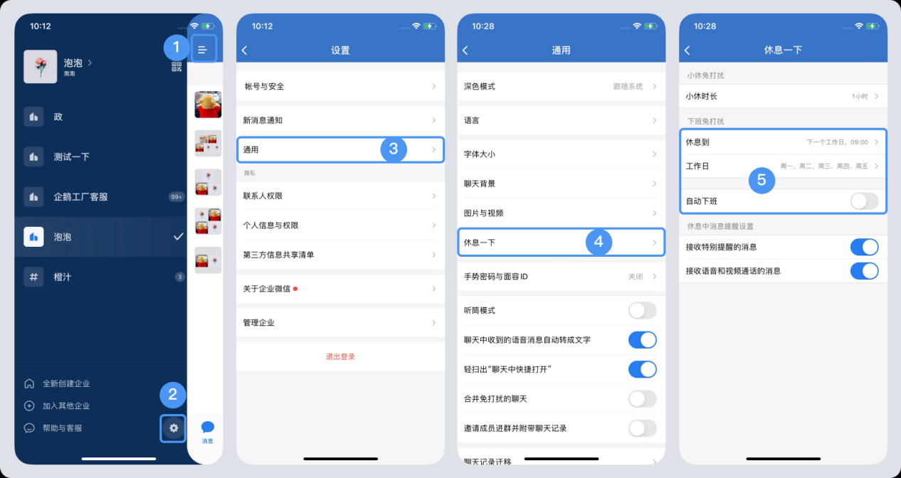 3、把“休息一下”狀態進行關閉。登錄手機端企業微信,“三橫杠”——右下角“設置”——“通用”——“休息一下”——關閉“自動下班”。
